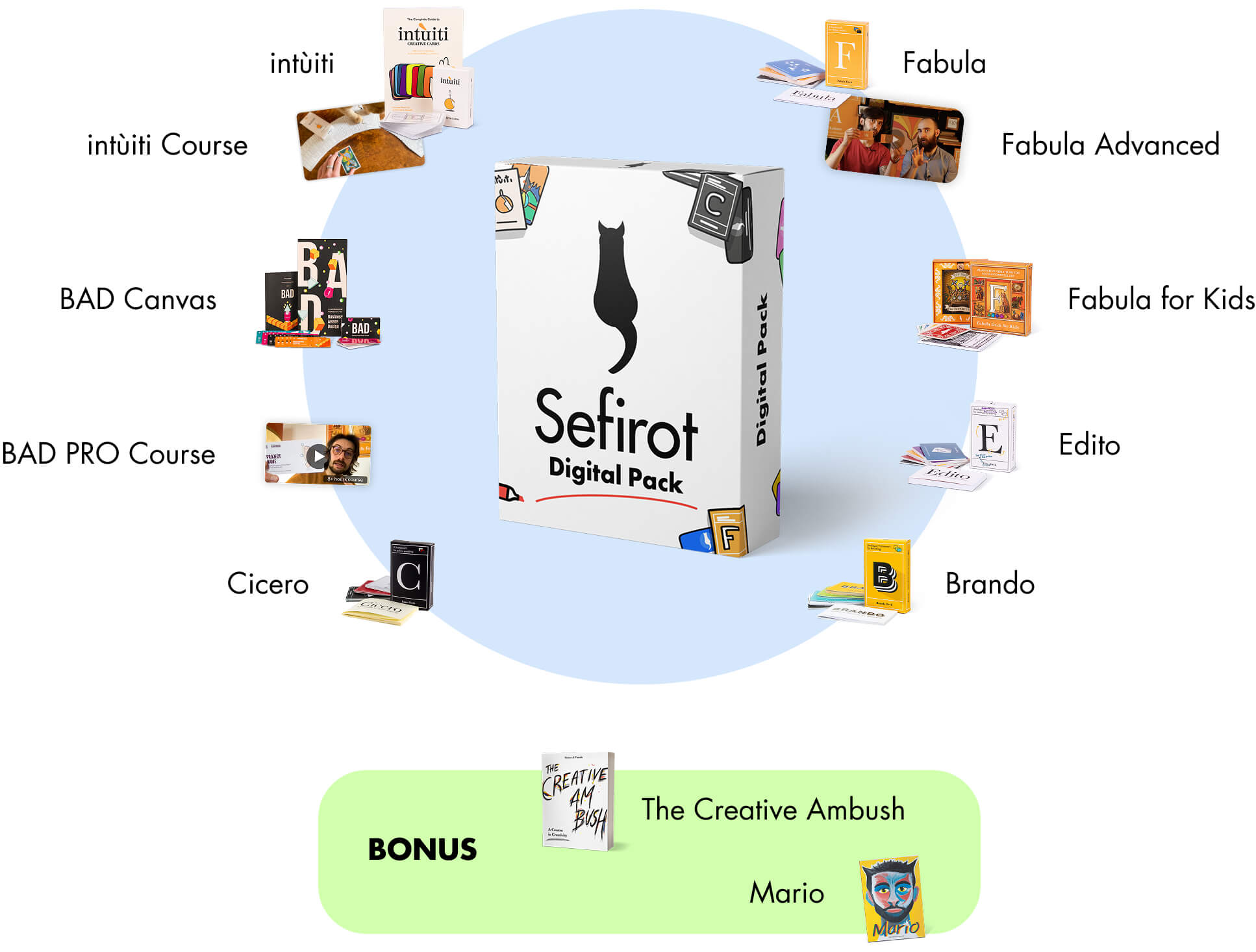 A digital-only pack containing everything we've developed over these years of creativity: tools, manuals, video courses, all accessible anytime and from anywhere.