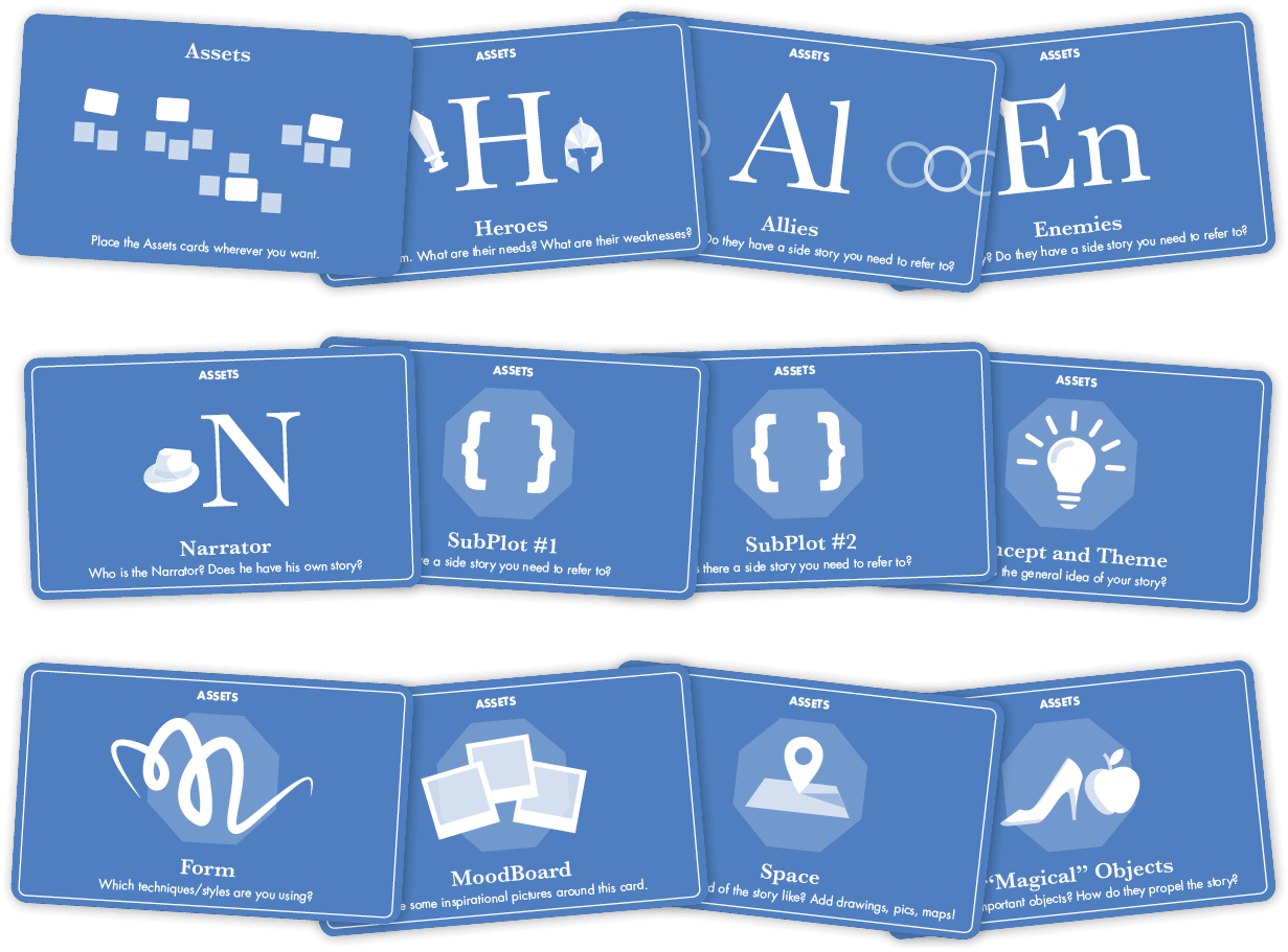 Use the ASSETS cards to build the universe of your story, sticking notes, maps, images, and whatever else comes to your mind around the cards.
