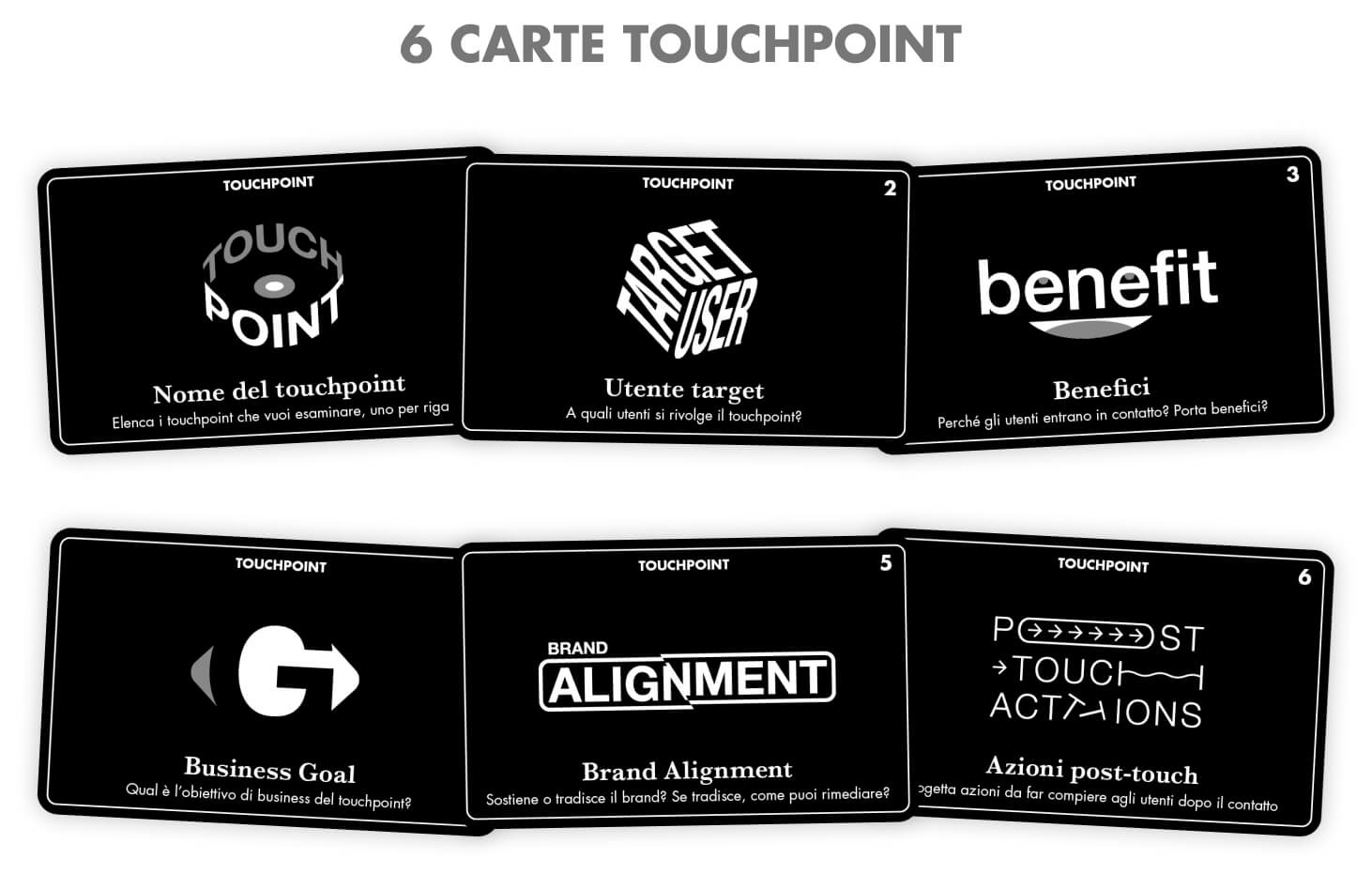 I touchpoint sono tutti i punti di contatto del tuo brand con il mondo, da quelli fisici (negozi, staff ecc.) a quelli digitali (sito web, newsletter, adv ecc.)