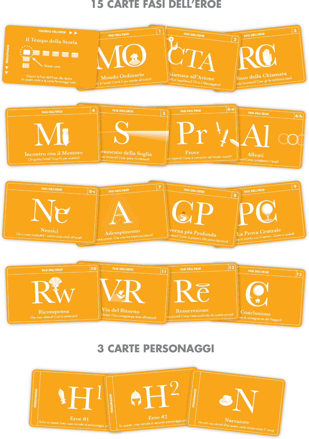 ci sono 15 carte che rappresentano le fasi dell'eroe, le tipiche fasi di sviluppo di un personaggio.