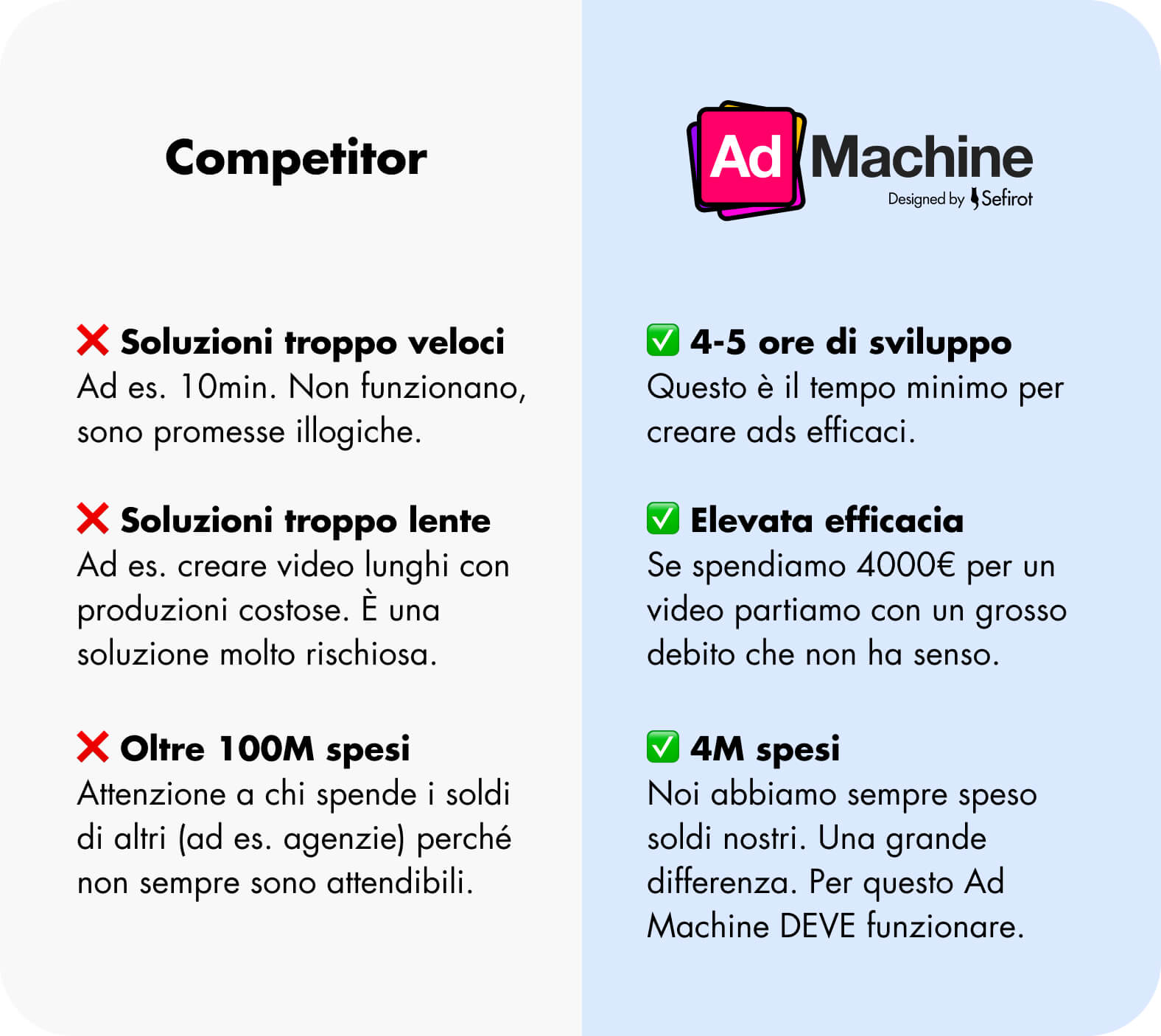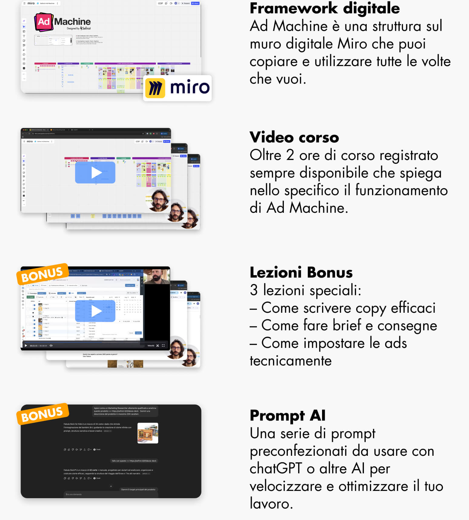 Dentro Ad Machine trovi 7 anni di prove, esperimenti, fallimenti e successi nel mondo delle ads e del Performance Marketing.